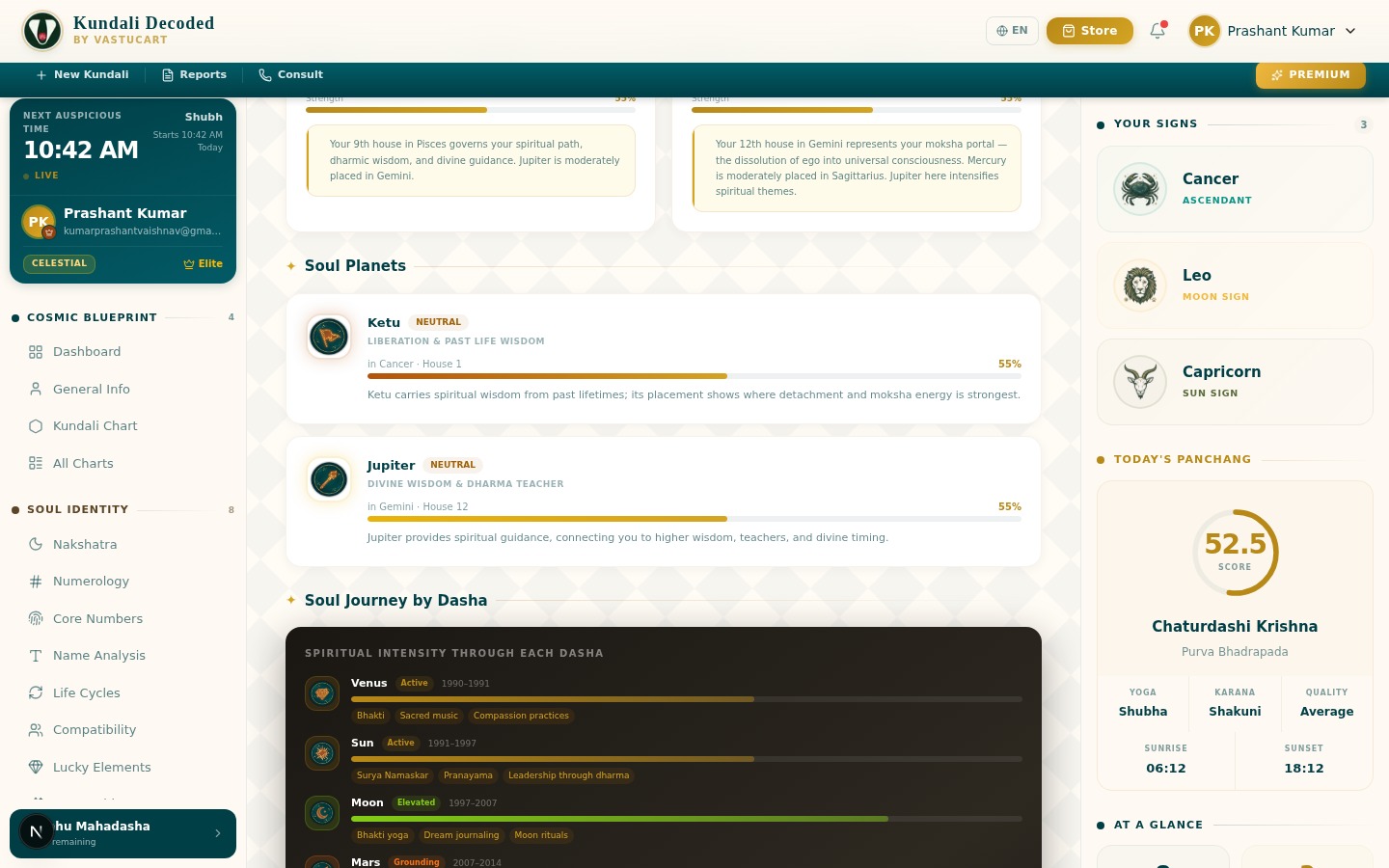 “The Atmakaraka section described my life purpose more clearly than any therapist, guru, or self-help book ever has. Sun as Atmakaraka in the 9th — 'leadership through dharmic teaching.' That's exactly what I do.”